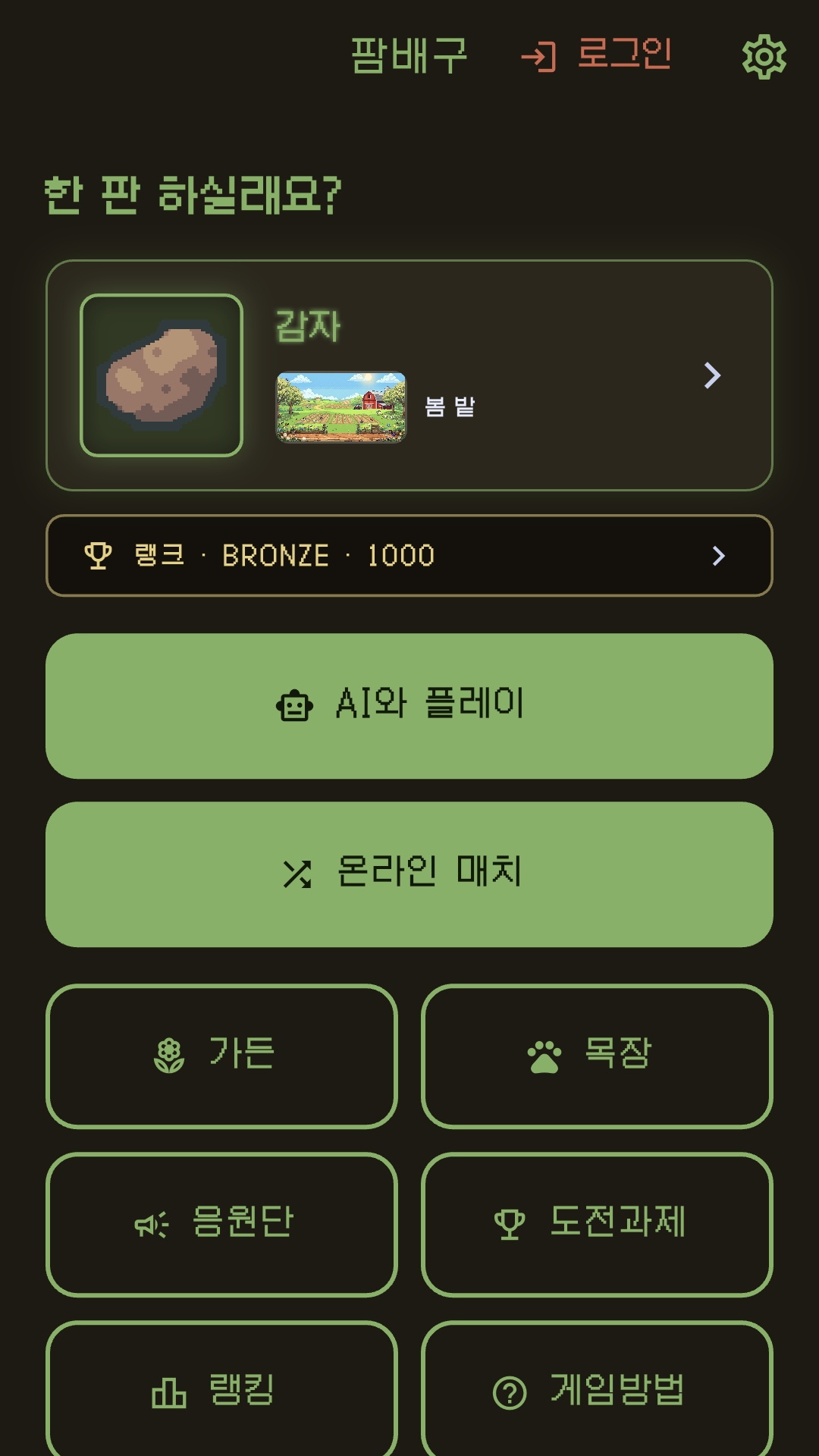 1988년 감자배구의 경쾌한 랠리 위에, 농장 친구들을 얹었습니다. 작물을 심고 키워서 나만의 선수·공·치어리더를 모으는 실시간 1:1 모바일 배구.